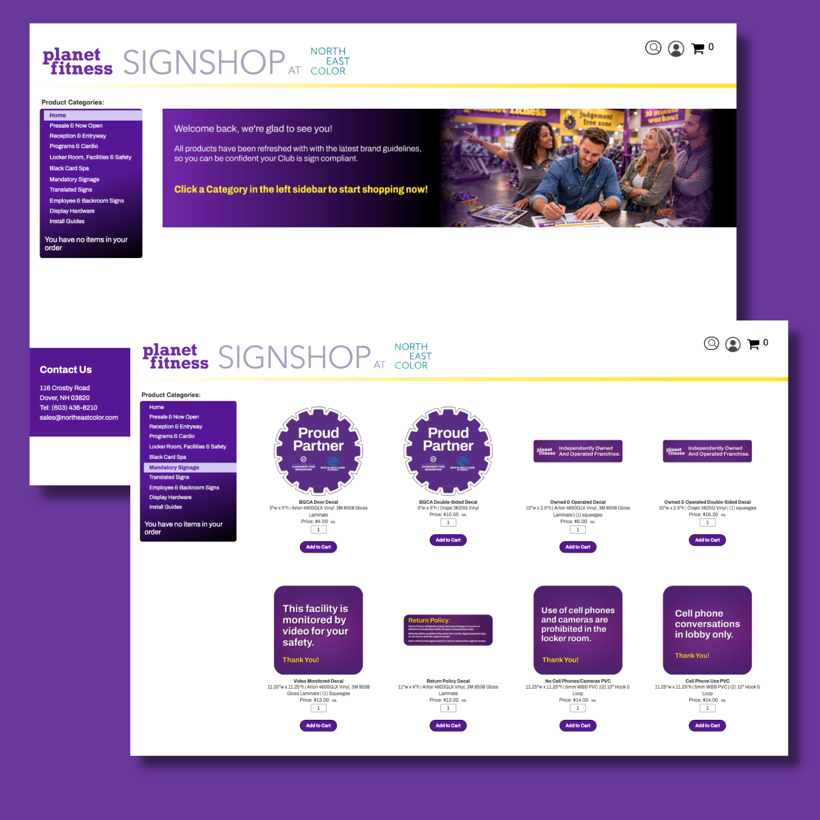 The PF SignShop is reopened and fully refreshed. Every product in the catalog has been updated to reflect Planet Fitness's latest brand standards — from wall coverings and interior signage to window graphics and the iconic PF digital clock.